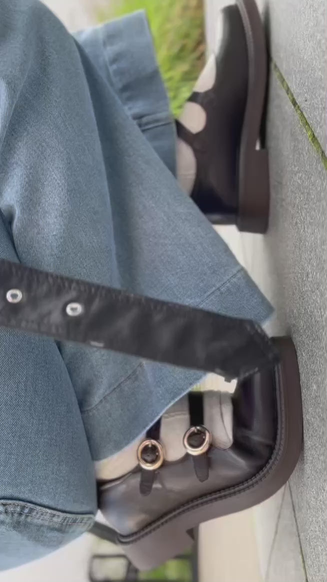 Dviejų juostelių Mary Jane siluetas – klasikos ir drąsos sintezė. Paauksuoti sagteliai tarsi šnabžda: „Pažvelk, jei drįsti“. Minkšta oda, tarp šarvų ir šilumos, priglunda prie miesto ritmo. Tai batai galerijoms, vėluojantiems traukiniams ir trumpiems, bet giluminiams žvilgsniams iš praeivių.