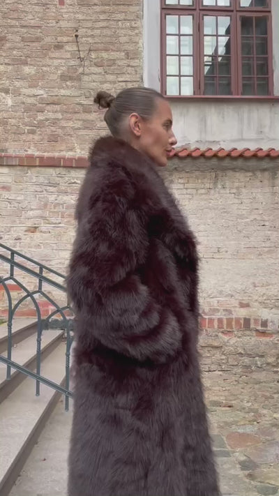 Tai nėra dar vienas kailinukas – tai išėjimas. Ilgas, sunkiai nepastebimas, tirštai šokoladinis faux fur paltas, kuris ne puošia, o perrašo tavo siluetą. Neperšlampamas aplinkos triukšmui, nei tendencijoms – tik ramus, beveik teatrinis buvimas. Jei žinai, kam skirta tokia forma – tu jau viena iš savų.