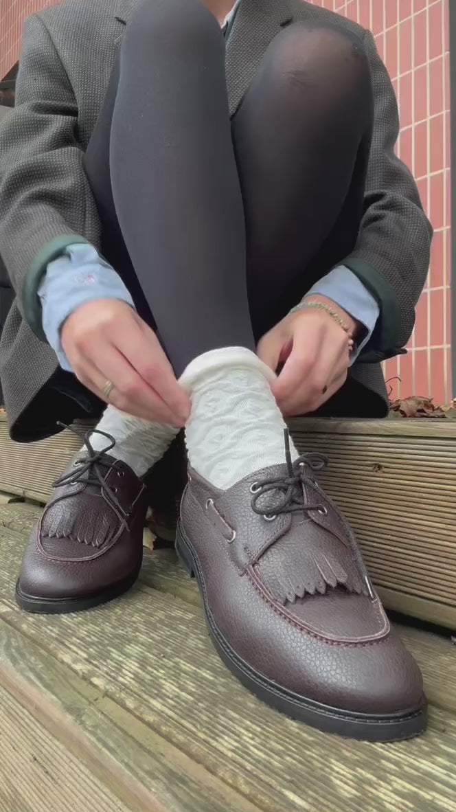 Liežuvėlis su kutu prideda nebanalios ironijos, o viršutinės kilpos lyg prisimena boat shoe laikus – tik be burių, be pozos, be pretenzijų.