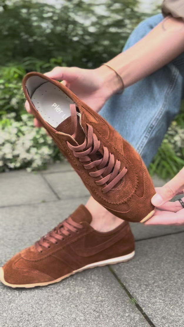 Šie sportinio silueto batai – tarsi atvirlaiškis iš 7-ojo dešimtmečio Kalifornijos: šilto veliūro faktūra, karamelinis atspalvis ir nesumeluotas paprastumas. Jie kalba apie lengvumą, kuris kyla ne iš tuštumos, o iš aiškumo – kai žinai, kas esi, ir tau nebereikia nieko įrodyti.