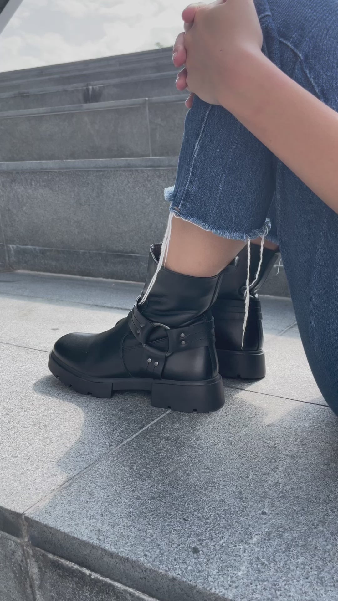 Išlaisvinkite savo maištingąją pusę su šiais juodais odiniais aulinukais, sukurtais tiems, kas vertina drąsų ir užtikrintą įvaizdį. Su metaline žiedo detale ir dirželiais šie batai suteiks jūsų įvaizdžiui aštrumo.
