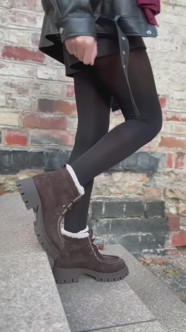 Minkštas šokoladinis atspalvis, grubaus rašto padas ir balta vilna, kyšanti kaip netyčia atverstas asmeniškumas – tai batai, kurie tarsi tyliai šnabžda apie žiemos rytus, kavą išsinešimui ir susitikimus, į kuriuos einama ne todėl, kad reikia. Jie nevaidina stiliaus – jie jį jaučia. Ir jeigu žinai, ką reiškia šiltas vidus po griežtu paviršiumi – žinai, kad šitas modelis yra apie tave.