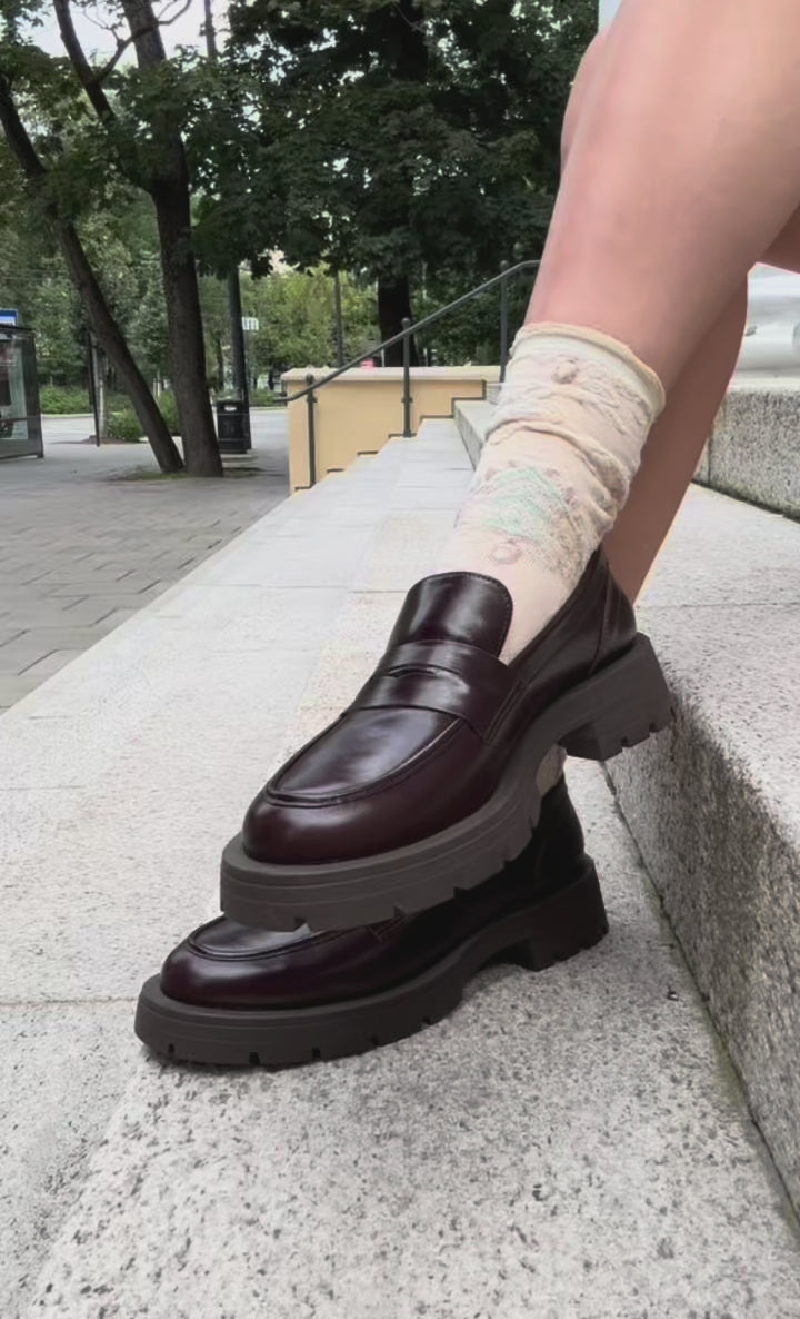 Kai klasika pasuka alternatyviu keliu. Šie bordiniai loferiai – tarsi griežtas architektūrinis potėpis kitaip švarioje aprangos kompozicijoje. Blizgus paviršius kontrastuoja su masyvia platforma, o formalus siluetas įgauna beveik maištingą aurą. Jie skirti toms, kurios nemėgsta garsiai kalbėti, bet moka padaryti įspūdį.