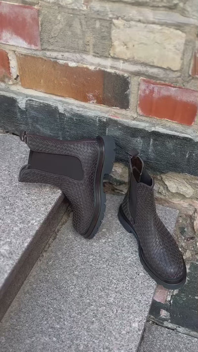 Эти ботинки – словно архитектура брутализма, переплетённая с поэзией ремесла. Уверенный силуэт, выразительная подошва и изящный узор плетёной кожи создают контраст, который не кричит, а убеждающе звучит вполголоса. Они для тех, кто выбирает тихий авторитет и умеет выделяться даже тогда, когда все одеты в чёрное.